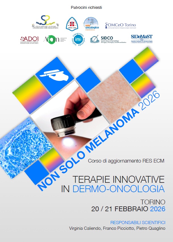 Non solo Melanoma 2026. Terapie innovative in dermo-oncologia. Torino, 20/21 febbraio 2026 Scarica il programma in PDF SEDESTARHOTELS MAJESTICCorso Vittorio Emanuele II, 54 - Torino PRESIDENTI Virginia Caliendo, Franco Picciotto, Pietro QuaglinoCrediti ECM: 9,1Per ulteriori informazioni: https://www.clustersrl.it/res-non-solo-melanoma-2026 Facebook Share Twitter Tweet Pinterest Linkedin Share Tumblr Email Send by email Reddit Share in Reddit